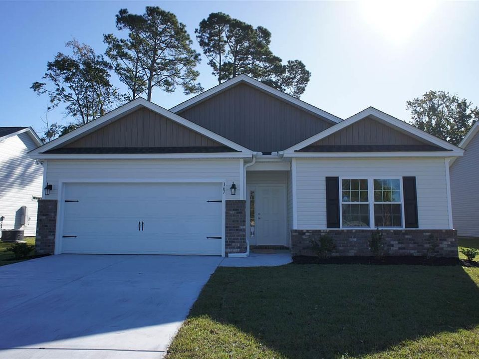 Beautiful Topsail floor plan under construction in Ocean Palms. This terrific open floor plan, 3 bedroom, 2 full bath home will have upgraded waterproof laminate flooring under the soaring vaulted ceiling in the family room, kitchen and dining area and comfortable carpet in bedrooms. Stainless appliances, staggered height Shaker-style white painted cabinetry and a gorgeous granite kitchen island combine to give the kitchen the wow factor you're looking for. A French door in the dining area leads to a large covered porch with a patio. The spacious owner's suite features a tray ceiling, long vanity with double sinks, an oversized walk-in shower, plenty of storage in the cabinetry plus two huge walk-in closets. Two additional bedrooms and a bath are tucked off on their own private hallway, for privacy. All of the homes in Ocean Palms come standard with the luxury of Natural Gas (tankless water heater, gas heat, and gas range). The garage is completely trimmed and painted. Ocean Palms is conveniently located near shopping, restaurants, schools and world class medical offices and hospitals, and a short golf cart ride to Surfside Beach's gorgeous beach and the Atlantic Ocean. Other floor plans and inventory homes may be available. Community Pool and Cabana are now open! Photos are of a completed, similar home and may have different features.