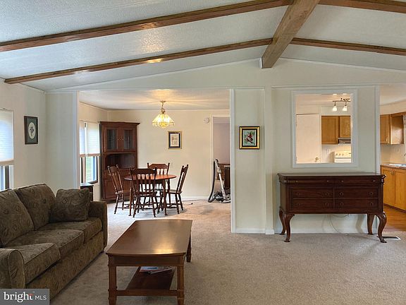 This freshly painted, newly carpeted 2 bedroom/2 bath home is move-in ready!  This home features an enclosed porch with a brand-new carpet that keeps you safe from the elements as you enjoy your morning coffee and keep an eye on the neighborhood.  The familiar Wayne model showcases a spacious Great Room with a cathedral ceiling and beams and shades on all windows that allow the flexibility you need to make it your own.  This room opens up to a sizable dining room with the furniture included.  The functional eat-in kitchen has multiple cabinets, counter space, and a food pantry along with your major appliances. The huge primary bedroom is just off the dining room and has an ensuite bathroom with a double sink, large closet, and shower stall.  The second bedroom is at the front of the home with two closets and an updated hallway bathroom with a step-in shower stall.  A laundry room is just off the kitchen and includes a washer and dryer with storage space.    Most of the furniture is included in the sale.  Come see this affordably priced home and get ready to settle in time for spring!