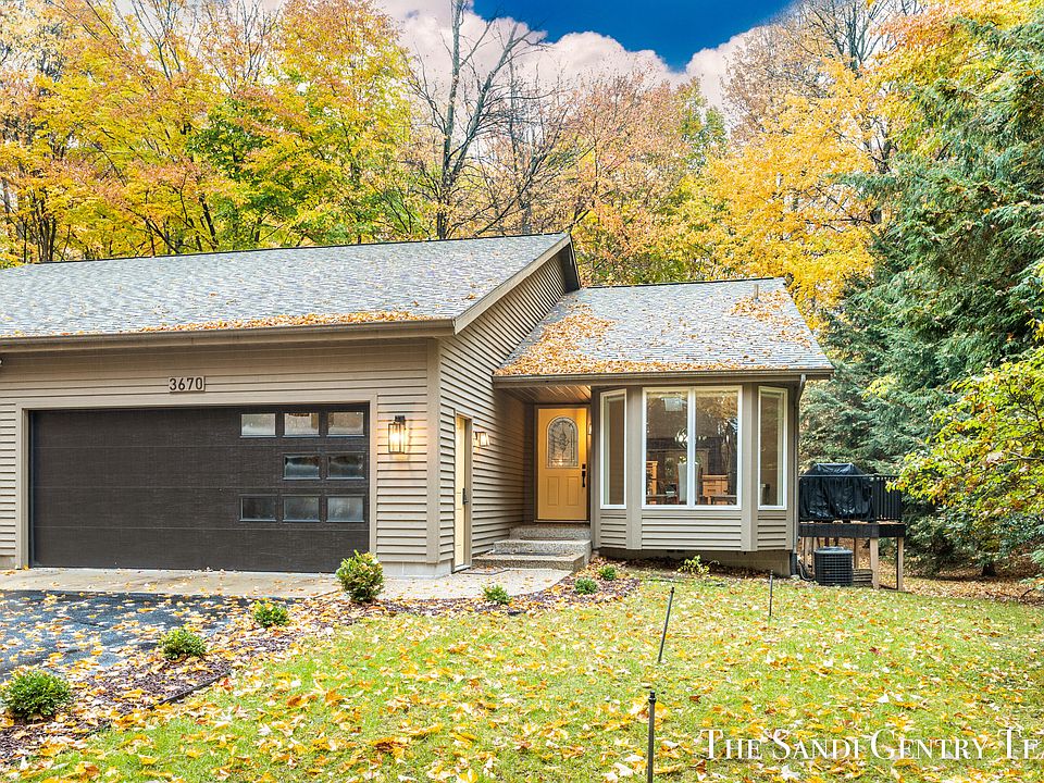 Enjoy Easy living with over an Acre of Private Woods in this Completely Renovated Condo With over 2,700 sf, 2 Bd, 2.5 bath featuring cathedral ceilings, skylights, hardwood floors, open main floor living, & beautiful updates throughout. The fully applianced kitchen features white cabinetry, quartz countertops, breakfast nook and opens into the dining area. Great room has a gas fireplace with stacked stone and timber barn beam, as well as a slider that leads to the wrap around deck. Updated 1/2 bath and laundry conveniently located on the main floor. The beautifully updated primary suite features a stunning ensuite with walk-in tile shower and double vanity. The lower level has an addl full bath, bedroom, family room with gas log fireplace & plenty of storage space. Call Today
