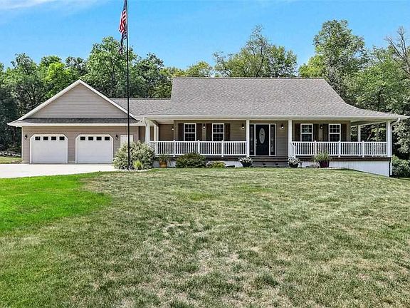 Welcome home to your little slice of heaven! This amazing property nestled in the woods features a charming country ranch-style home with an inviting wrap-around porch, 3 bedrooms, and 2.5 baths and is situated on 4.15 acres of natural beauty backing up to a wooded retreat on the Wapsi River on a hard surface road. The Main floor offers newly refinished hardwood floors, fresh paint, a great room with a fireplace and lots of natural light, a beautiful eat-in kitchen with cherry cabinets, granite countertops, and stainless steel appliances, a primary suite with a newly remodeled bath complete with dual sinks, soaker tub, shower, and walk-in closet with a moveable closet system, and an office There is main floor laundry including a pantry/closet room, too. The lower level will impress you with a spacious family room, sauna, two additional bedrooms, and bath. There is a work room/utility room in addition to a utility area and stairs into the two-stall attached garage. For the toy collector, you will find a detached garage with loads of room for all of your hobbies and it includes a Man Cave complete with a bar. Take note of the new concrete driveway from the road to the garages which is a huge bonus! Walk outside and find tranquility and peace and take a stroll down the path in the woods and dip your toes into the Wapsi, or throw a line in and see what you can catch. This acreage has it all and will not disappoint. Schedule your showing today!