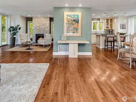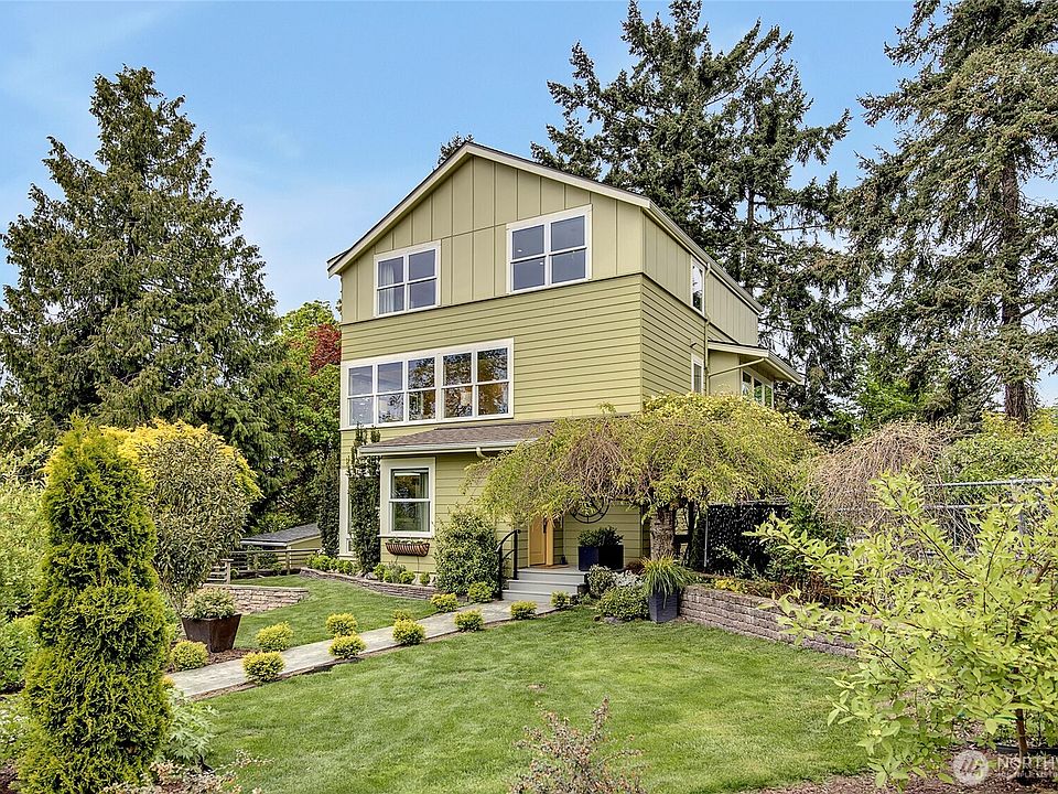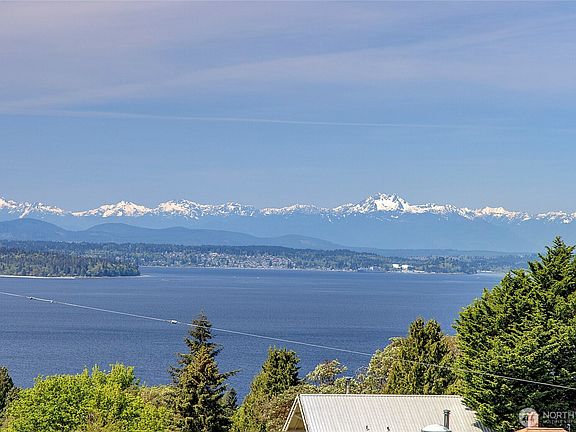 Beautiful sound and mountain views greet you in the 2018 remodeled home. Nestled down a long driveway offering privacy and security. Light and bright throughout. Flowing floorplan with open kitchen, walk-in pantry, island cooktop, breakfast bar and ample storage. The dining and living rooms connect with a gas fireplace and slider to the deck. The second-floor family room offers gorgeous views of the Olympics plus two bedrooms, a jack and jill bath and utility room. The top floor primary suite has two walk-in closets and a Juliet balcony plus a den/office (covert to 4th bedroom?). Meticulously landscaped, you'll love this in city oasis. Plenty of parking. Minutes to the ferry, airport, downtown, parks, restaurants and shops.