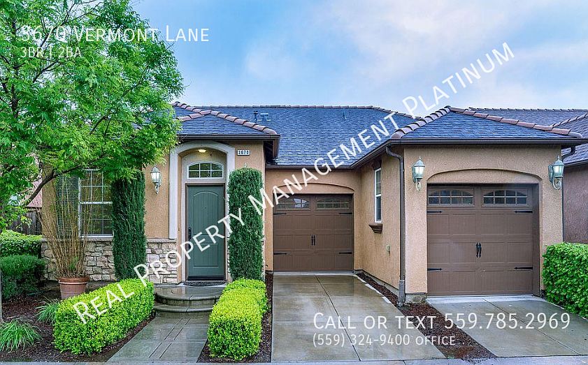 3 bed, 2 bath home in Harlan Ranch! 1280 sq.ft., built in 2005. Enjoy walking paths, pool, clubhouse, parks, BBQ area & playground. Open floor plan with high ceilings, 2-sided fireplace, and granite kitchen island. Kitchen appliances include refrigerator, gas range, gas stove, and built in microwave. Main bedroom features walk-in closet & dual vanity bath. Includes washer/dryer. Fenced backyard with covered patio. Tenant responsible for yard care. Walk to park & pool! Credit score above 650 REQUIRED. Small pet considered with additional pet rent. No smoking. Renter's insurance is required. Cross streets are Shepherd & DeWolf. DRE# 01901101. All information is deemed reliable but not guaranteed and is subject to change. Dre# 01901101 Non Smoking Renter's Insurance Required