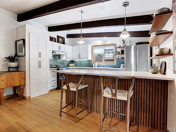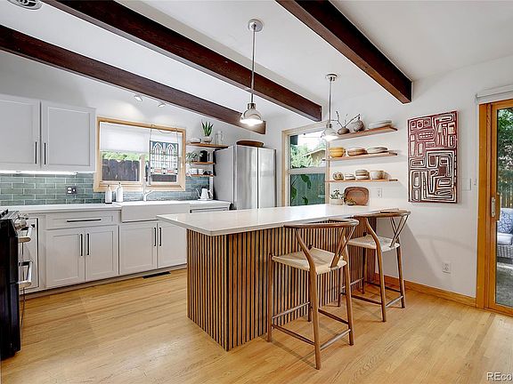 Discover this stunning midcentury modern ranch-style home, perfectly blending style and comfort. The newly renovated kitchen boasts modern appliances, a spacious island, and an inviting dining area, ideal for gatherings. Enjoy the warmth of a double-sided fireplace that enhances both the living room and kitchen. The primary bedroom features a private 3/4 bathroom, providing a tranquil retreat. With vaulted ceilings and exposed beams, the home exudes character and charm. Three spacious bedrooms on the main level ensure ample living space, while a newly landscaped backyard with fresh sod offers a perfect outdoor oasis. Conveniently located near I-70 and a variety of amenities, this home is a true gem!