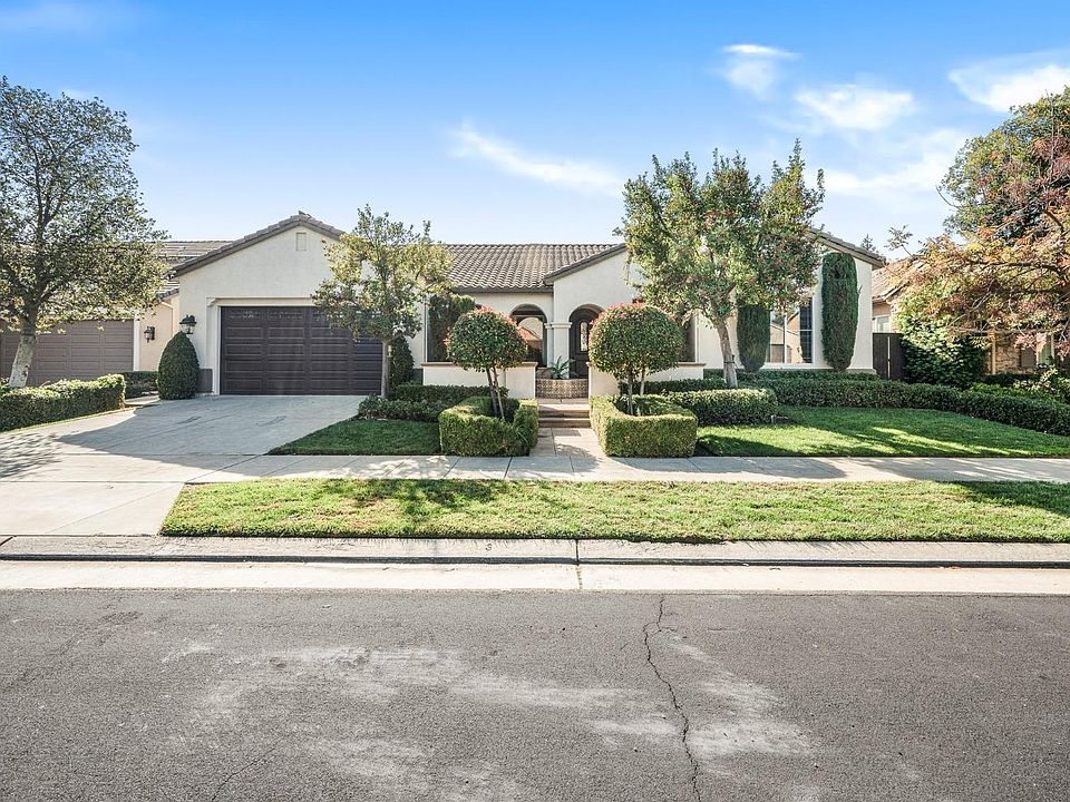 Welcome to this stunning former model home in the highly desirable Leo Wilson Rivage community of Harlan Ranch. Offering 4 bed, 3 bath, and 2,344 sf of beautifully upgraded living space, this home is a true showpiece. Step inside to find intricate travertine flooring, crown molding, and soaring vaulted ceilings that flow seamlessly throughout. The open concept chef's kitchen is a dream, featuring custom cherry wood cabinetry, a built-in coffee bar, granite countertops, stainless steel appliances, and a large center island that overlooks the spacious living room with custom built-ins. The luxurious Primary suite is a serene retreat with vaulted ceilings, wainscoting accents, and a spa-like bathroom with a soaking tub, separate shower, dual vanities, and walk-in closets. The home also boasts a versatile room with French doors, ideal for a 4th bedroom, formal dining, office or game room. Outside, the professionally landscaped backyard is an oasis, complete with a sparkling pool, water features, lush grass for play, and a cozy patio area to relax or entertain. The home also features an owned solar system, ensuring energy efficiency and savings year-round. For car enthusiasts, or those in need of extra space, the 3-car tandem garage offers ample room for multiple vehicles, a workshop, or even a home gym. Harlan Ranch offers beautifully landscaped grounds, a community pool, clubhouse, walking trails, and 11 parks, creating the perfect setting for relaxation and recreation.