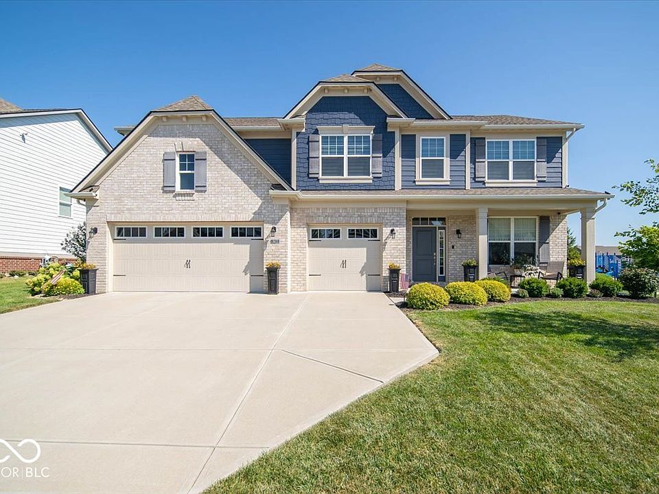 Discover a gem in Morningside, where luxury meets comfort in this exquisite five-bedroom, three-and-a-half-bathroom residence. As you step through the front door, a grand foyer welcomes you, setting the tone for the elegance that awaits. The heart of this home is undoubtedly the gourmet kitchen, a culinary enthusiast's dream. It boasts a gas stove, gleaming stainless steel appliances, a stylish backsplash, and a center island that complements it. The grey cabinets add a touch of timeless charm, while the adjacent breakfast area, complete with a coffee bar and wine fridge, is perfect for casual dining. The great room, with its gas fireplace and remote-controlled blinds, is bathed in natural light, creating an inviting atmosphere for family gatherings. An office provides a quiet space for work or study, while a conveniently located drop station near the garage helps keep things organized. A fifth bedroom on this level offers an ensuite full bathroom, offering privacy and convenience for guests or family members. Upstairs, the primary bedroom is a true retreat, featuring a spacious walk-in shower, raised vanity with double sinks, and a generous walk-in closet. Three additional bedrooms, each with walk-in closets, share an updated bathroom. A loft area with a ceiling fan offers versatile space for various uses. Outdoor living is just as delightful, with a covered porch, a built-in grill station, and a picturesque concrete patio surrounded by beautiful landscaping-your personal oasis for entertaining or quiet contemplation. A 3-car garage rounds out this incredible offering, ensuring space for storage and vehicles. Don't forget the sophisticated outdoor lighting! This property's location is a bonus, with a playground and community pool just next door. Center Grove High School is within easy reach, and nature enthusiasts will appreciate the proximity to Kephart Park. Experience the best of modern suburban living in a home that truly has it all!