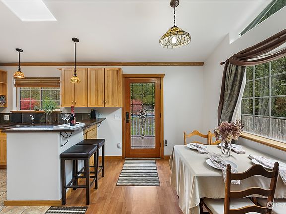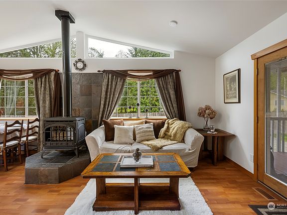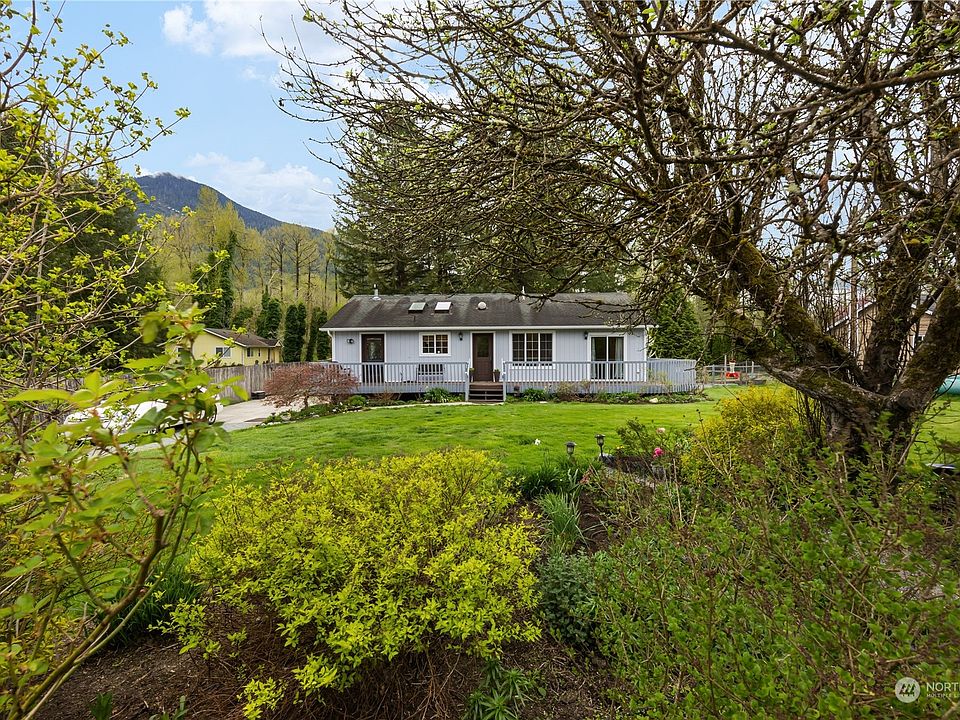 Majestic mountain views and river access punctuate this darling freshly painted rambler with 2 beds, 2 baths, and office. Huge wrap-around deck allows you to bask in the surroundings and gorgeous gardens. Enjoy the Stillaguamish River out the gate from big back yard and raised bed gardens on the fully fenced near acre lot. Close to White Horse trail and hiking. Inside, enjoy laminate floors, new carpet, skylights and a cozy propane fireplace in the living room with vaulted ceilings. Kitchen boasts silastone countertops, Jenn-Air gas range, maple cabinets and stainless fridge. Home is wired for generator, has cable and high-speed internet, so you enjoy all the modern comforts while living next to the mountains. This home is a MUST SEE!