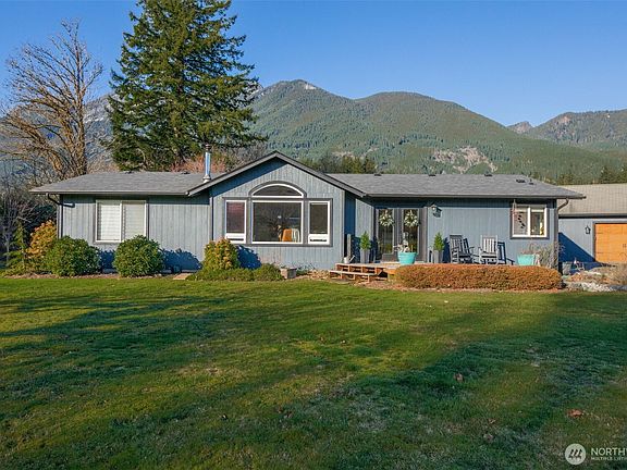 Nestled among the snowcapped peaks of the North Cascades, this extraordinary home is a sanctuary for those who seek beauty and serenity. From the moment you step inside, you’ll feel it was crafted just for you. Rich red oak hardwood floors set the tone, while breathtaking mountain views from every window create a dramatic and ever-changing backdrop. The open floor plan is designed for modern living and effortless entertaining. The spacious primary suite features a walk-in closet and a beautifully appointed ensuite. In the living room, a pellet stove adds warmth and a cozy cottage ambiance, perfect for mountain evenings. Lovely office space for remote work. Recent updates include a new roof and carpet in 2023, along with fresh paint, a patio, gazebo, and deck in 2025. The oversized utility room offers abundant cabinetry and storage. An expansive shop accommodates two vehicles, includes an EV charging station, dedicated shop space with 220 wiring. Outdoor amenities abound: a machine shed and greenhouse for easy country living, a hot tub, swimming pool, and horseshoe pit for recreation, plus mature fruit trees, berries, garden space, and an idyllic seasonal creek. Resplendent and heart-achingly beautiful, this remarkable property must be experienced in person to be truly understood.