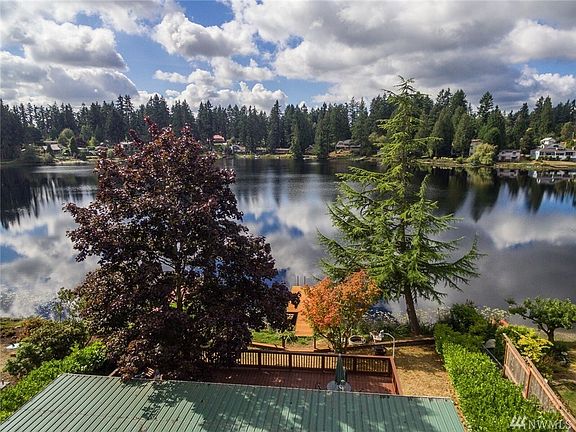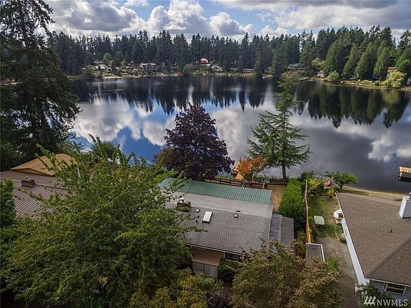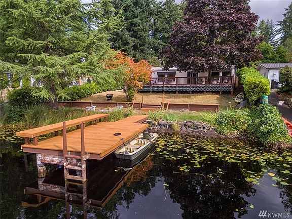 Affordable WATERFRONT!! On the Peaceful sanctuary of 5 Mile Lake. Pristine Setting! 2 Bedroom, 1 bath, on 68 feet of no bank lakefront with dock. Beautifully landscaped, fire pit by water's edge for summer evenings. Kitchen w/Oak Cabinets. Private setting down easement road.Close to all amenities; airport, shopping , I-5 and 167.. 2 car detached garage with 220 sf. MIL apt. 3/4 bath. Just shy 1/2 acre with plenty of room for all your toys and RV's. It Feels like being on vacation year round!