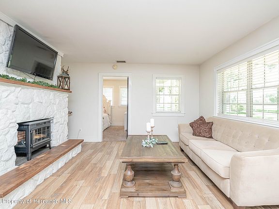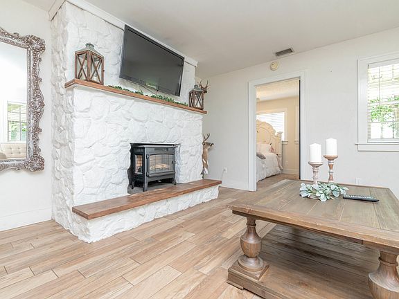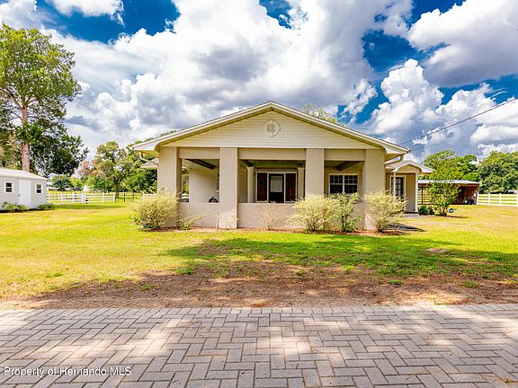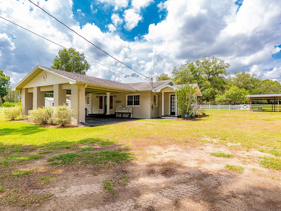 Bring the animals! This shabby-chic farmhouse is like a page out of a magazine! Driving home on the beautiful Trilby Rd to your 6.67 acres in the rolling hills of Dade City will never get old. The private driveway is lined with a white 4 board fence that leads you in and surrounds the property. Large Grandfather Oaks, Pecan, and Peach trees are scattered through the yard and pastures. There is irrigation throughout the lawn surrounding the home. An old-fashioned timber sided 4-stall barn with electric connects to just over 6.5 acres of pasture for the animals. The pasture is ready for grazing and includes water and 50 amp electrical hookup for an RV! The connected carport with colonial style pillars will keep you dry during the warm summer showers and lead you into this 3-bedroom 1-bath shabby-chic style farmhouse featuring old southern farmhouse doors, a stone fireplace, wood-like ceramic tile, and a walk-in laundry room and pantry. The bathroom features a farmhouse style sink, open vanity and shelving, and even a rustic metal tub surround! The Kitchen is simple and spacious, featuring butcher block counter tops, open shelving, a large white farmhouse sink, and stainless steel appliances to top it off. In less than 10 minutes you can be back on I-75 and on your way to Ocala, Orlando, or Tampa within an hour. Or take a quiet country stroll to downtown Dade City for a day of antiquing or an evening at the up-and-coming ''BLOCK''.