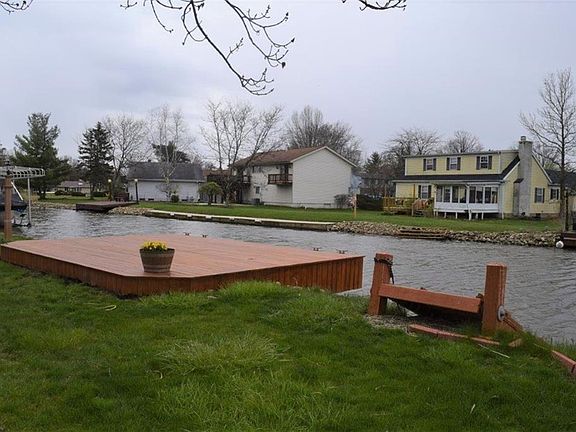 Here's your chance to have water views from your new home! 4 bedroom 2.5 bath colonial on Aurora Shores Channel. Covered front porch, very spacious living room open to dining room both featuring hardwood floors. Cozy family room with a fireplace and sliding doors to a patio. Great kitchen with lots of cabinets and counter tops open to dining room. Off the dining room is a step down into a large great room with french doors out to the backyard. Second floor features oversized master suite with full bath, and 3 generous guest bedrooms with newly remodeled bath. Newer $9,000 dock installed over a year ago that is 16x20! Great for fishing, kayaking or parking your boat! This home is unbelievable for entertaining. Aurora Shores offers a 305 acre lake, marina, two swimming pools and play grounds, tennis courts, sand volleyball and much more. It's like being on vacation all summer! Don't miss out.