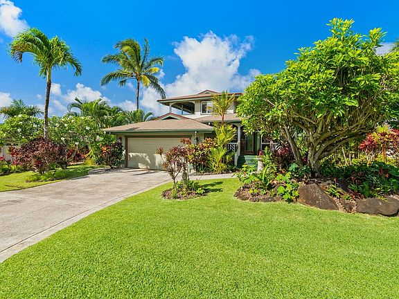 Great location in Princeville with some ocean and mountain views. Four bedrooms and three and one half baths provide ample space. The primary bedroom suite has a nice covered lanai. The reverse floor plan with open kitchen and living area design showcases a large covered lanai with the views. The garage has built-ins for added storage and there is additional space underneath the rear raised portion of the home. Enjoy air conditioning on the warmer island days. The property is beautifully landscaped with newly installed irrigation. Convenient location on Albert Road, close to shopping, world class golf, restaurants, tennis, pickle ball and beaches that are a short drive away.