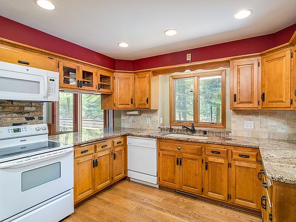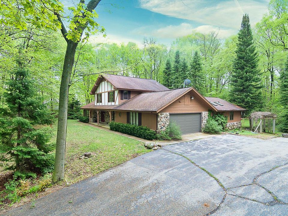 Down a winding wooded driveway you'll find privacy personified in this 3 bedroom home nestled on 4 acres of forest. Features include large gourmet eat-in kitchen with granite counters, large great room with cathedral ceilings and floor-to-ceiling stone gas fireplace, and huge master suite with luxurious private bathroom with whirlpool tub and beautiful oversized walk-in shower. Patio doors from master bedroom lead to the large wooden deck perfect for entertaining or enjoying your morning coffee overlooking nature. You'll appreciate all the optional 4th bedrooms affords - plenty of room for a home office, study, or playroom. Other highlights include hardwood floors, 6-panel doors, and 1st floor laundry room. Plenty of room to spread to your wings inside and out!