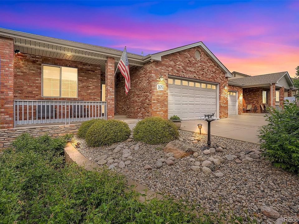 Backing to open space and showcasing stunning views, your new home awaits at this Meadowbrook Ridge ranch duplex! Situated at the end of a quiet cul-de-sac, the home is immediately inviting thanks to great curb appeal, a charming front porch, and a welcoming foyer. Enjoy a spacious open-concept main floor accented by a soaring vaulted ceiling, brilliant natural light, sweeping views, and gorgeous hardwood floors. The well-appointed kitchen is equipped with granite countertops, an island with seating, ample cabinet space & stainless steel appliances while the living room is anchored by a handsome gas fireplace with a floor-to-ceiling stone surround. Designed with entertaining in mind, the dining room opens out to the sprawling covered deck that is the perfect place to dine al fresco. The private primary suite is located on its own wing and boasts a large bedroom with a tray ceiling, a walk-in closet, and a luxurious 5-piece bathroom complete with double sinks atop a granite countertop and a jetted tub. The main floor is completed by a sunny secondary bedroom, a bathroom with a granite countertop, and the laundry room. Excellent additional living space is found in the finished walk out basement that offers an expansive family room, a conforming bedroom, and a bathroom with a granite countertop. Soak up all 300 days of Colorado's sunshine from the oversized fenced backyard that hosts a covered patio, an additional flagstone patio, a lush lawn, and more open space views. Spend your weekends doing more of what you love and less yard work, the HOA covers all snow removal and lawn care! Great location blocks away from Meadowbrook Natural Area, an extensive trail network, and Mehaffey Park.