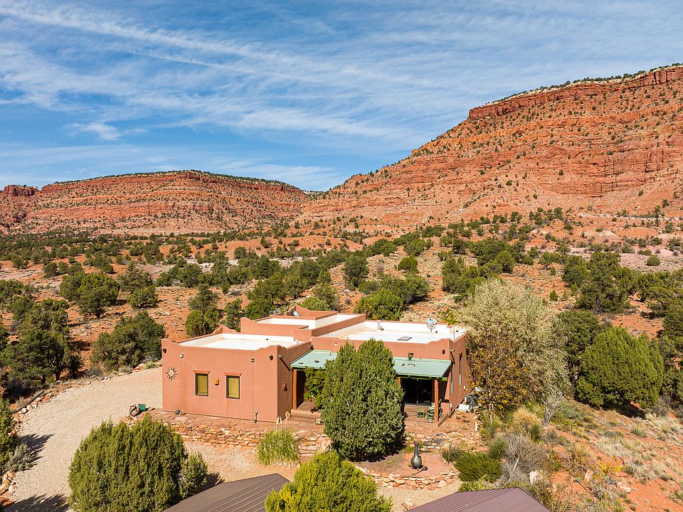 Custom Santa Fe-Style Stucco Home with Rooftop Stargazing Deck- Step inside and feel the warmth of Southwest design - custom tile floors, imported sinks, and log timbers accenting the tall ceilings. A river rock fireplace anchors the spacious living area, while large sliding doors open to a private, covered patio perfect for quiet mornings or evening gatherings. The unique kitchen features a large island with bar seating and connects seamlessly to a sun-drenched dining area ideal for entertaining. The 3-bedroom, 2-bath layout features a large peaceful primary suite with its own bath and direct patio access and views that make every sunrise feel magical. Downstairs, you'll find a partially finished basement with one bedroom already framed in, offering room to expand or customize to your vision. A spiral staircase leads to the rooftop deck - your front-row seat to unforgettable sunsets and clear desert night skies. Set at the back of a 2.24-acre lot, this home sits high for unobstructed views of the red cliffs and the Kaibab Mountain range - a dream for anyone who loves the ever-changing desert light. Experience the artistry and serenity of true Southwest living in this one-of-a-kind Santa Fe masterpiece. Buyer to Verify all details.