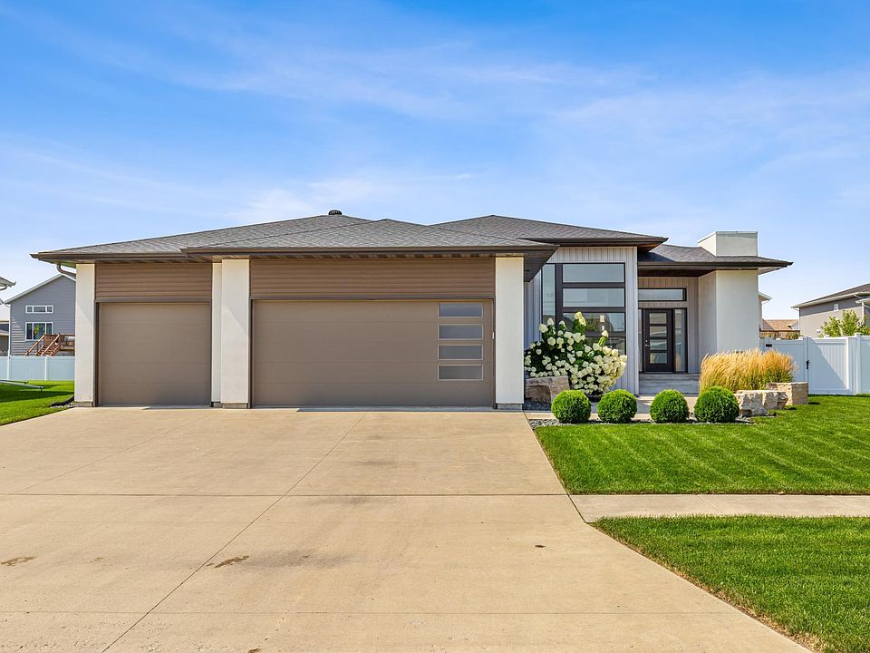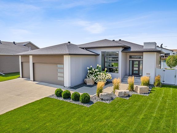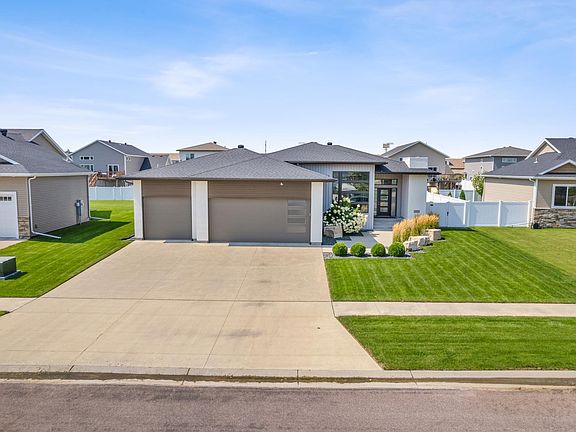Spectacular 6 bed, 4 bath rambler, built by Adobz, in wonderful neighborhood! This one owner property has a perfect mix of modern and warmth and has been maintained to perfection inside and out! The stunning main level features a gorgeous kitchen with an 8'4" island, professional 19 cu. ft. fridge and freezer, extensive/updated lighting, custom blinds, hardwood floors, 9 and 10' ceilings and a striking gas FP. There are three bedrooms and three baths on the main with the primary bath featuring dual sinks, tile w-in shower, expansive closet with washer/dryer/folding table and a private water closet. The 3rd bed doubles as a spectacular office with 12' ceilings, floor to ceiling windows, frosted privacy glass and a closet. The expansive basement has 8'9" ceilings, a beautiful wet bar with an 8'6" peninsula, three additional bedrooms with one featuring a huge w-in closet, full bath, great living space and washer/dryer hookups in the utility/storage room. Seller spared no expense on the exterior which features a meticulous lawn, fully fenced backyard, sprinkler system, 16 X 25 MF deck, custom egress covers, gas line for grilling, and extensive professional landscaping with impressive boulders, rock and plants. The three stall garage has an additional 90 sq ft storage space behind the third stall and is fully finished with a gas heater and floor drain. This home is tucked away on a quiet street, yet only three blocks from Sheyenne HS and close to so many amenities. There is truly nothing like this home on the market so don't wait to call your favorite realtor for a viewing!