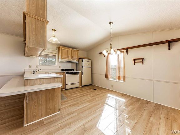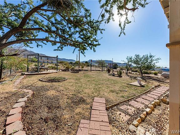Cute single wide home nestled on 1.17 acres with mature fruit and shade trees on drip system! This home offers 768 sq ft of living space, Open floor plan and indoor laundry with washer and dryer included! Newer hot water heater, Covered patio, Breakfast bar, Casual dining. Bring your horses and enjoy country living just 20 minutes from Kingman for shopping and hospital!