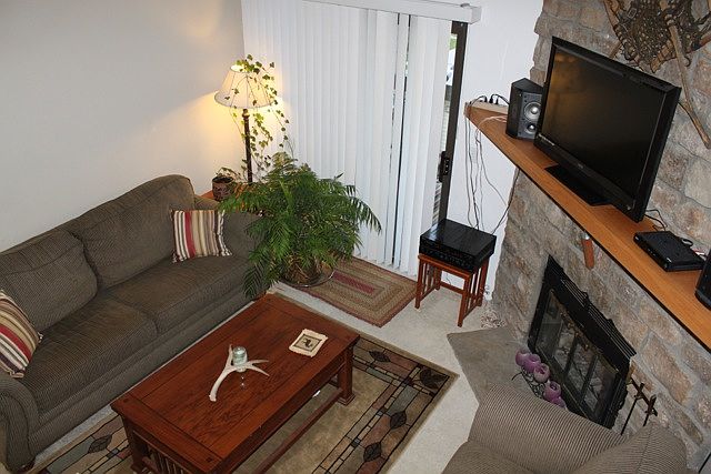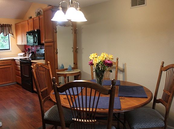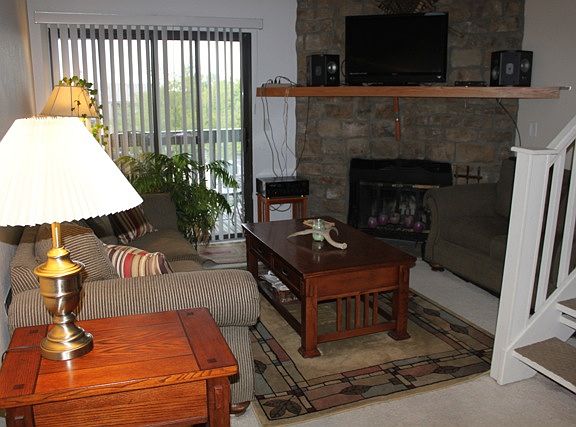 A rare penthouse in the Tall Pines community! ~ This bright two bedroom condo has vaulted ceilings with skylight and custom lighting in the kitchen, dining area, and loft ~ Enjoy a fire in the wood-burning fireplace or a cup of coffee on the private covered patio ~ Large master bedroom with bay window and walk-in closet ~ Bathroom includes a jetted whirlpool tub and upgraded vanity ~ Loft space above the dining area provides great space for an office ~ With large closets, storage on the patio, and attic space, there is plenty of storage ~ All appliances and window coverings included ~ Just minutes to the highway ~ Come see it today!