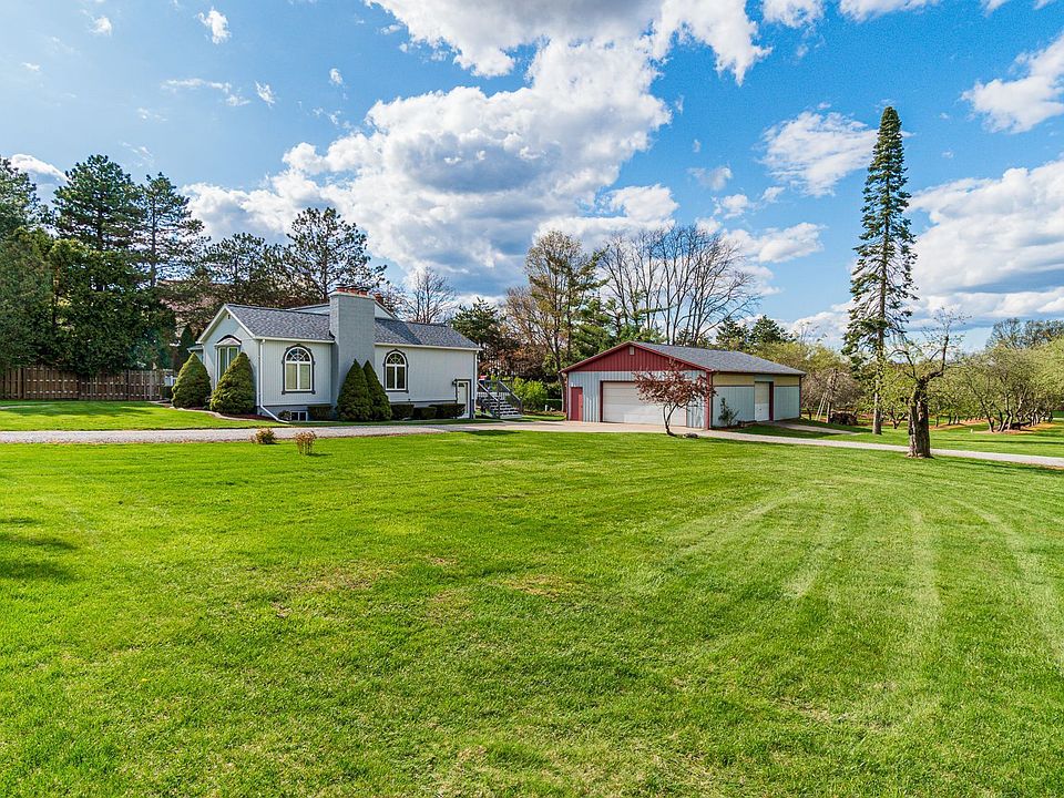 Looking for that special property? Look no further! Enjoy almost 2 acres of land complete with a 30x48 pole barn, circular driveway, apple orchard, and large private deck. Property faces common wooded area that will never be developed so you will enjoy that extra privacy. It is located on a section of 13 Mile Rd that won a beautification award for all the trees and natural beauty this particular area of 13 Mile provides. This 3 Bedroom, 2 full Bath home also features a large dining room/living room with bay window, palladium windows and a fireplace. Enjoy hanging out at the bar in the lower level with 2nd natural fireplace. The kitchen features high ceilings and tons of light. This unique home had a major upgrade in 1985. Roof was replaced on home and pole barn in 2022. You will NOT be disappointed! Close to freeways, restaurants, and shopping, this home's location is excellent. Welcome home!