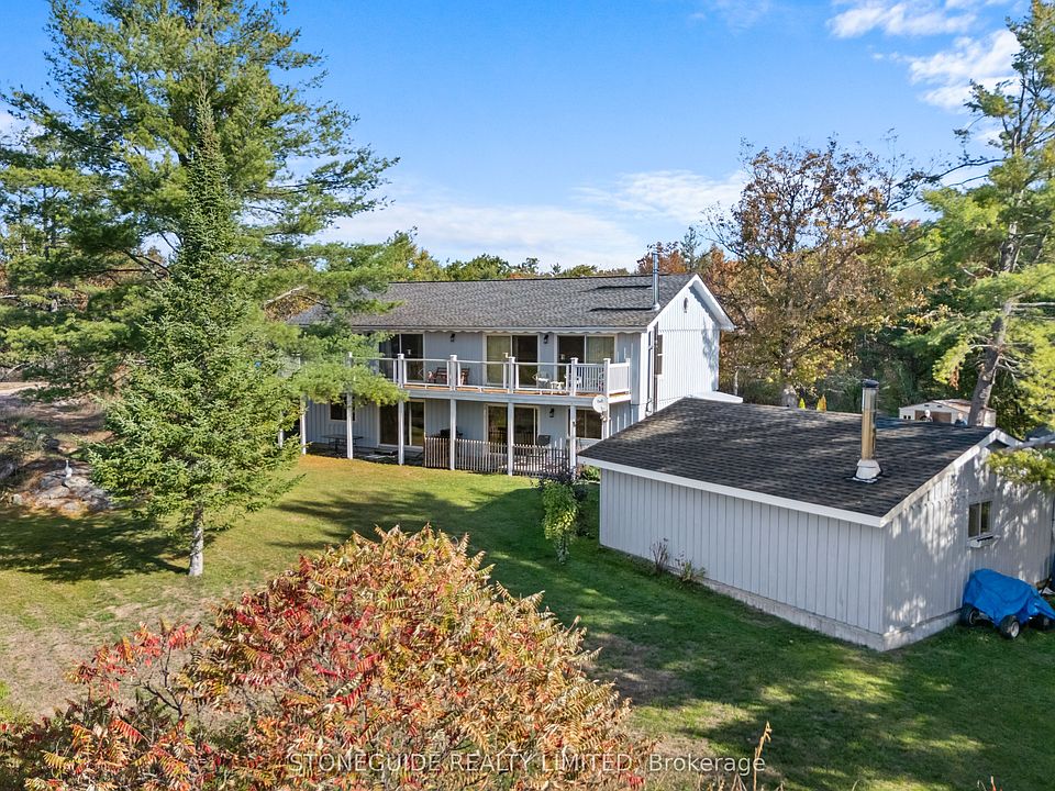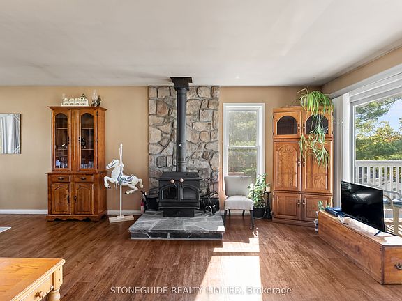Discover the perfect blend of privacy, comfort, and natural beauty in this charming country bungalow set on 1.7 acres across from stunning Stoney Lake. Perched on a granite ridge with lake views through the pines, this spacious home features 5 bedrooms and 2 full bathrooms, with 3 bedrooms on the main floor and 2 in the fully finished walkout basement - ideal for in-laws or guests. The lower level includes a second full kitchen, creating a self-contained apartment perfect for multi-generational living. Inside, you'll find a bright and airy floor plan with generously sized rooms and updated windows, doors, roof, and insulation, ensuring year-round comfort. Enjoy water views from nearly every window, and take advantage of the detached two-car garage, complete with a wood stove - an ideal workshop for hobbyists or car enthusiasts. Surrounded by nature and set in a peaceful, private location, this property offers a rare opportunity to live near the lake while enjoying space, serenity, and modern conveniences.