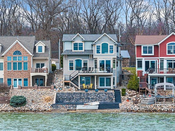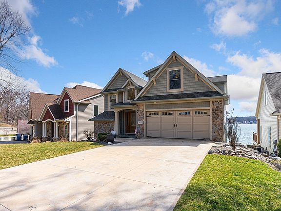 Experience the ultimate lakefront lifestyle in this stunning custom-built Bob Buescher home on the 2nd basin of Crooked Lake in Steuben County, IN. Designed for both luxury and functionality, this lake house has everything you need for year-round enjoyment. The property features a firm swimming area, concrete seawall, included vinyl dock system, breathtaking views from expansive windows, and a lakeside composite deck and stamped concrete patio perfect for entertaining. The home’s striking exterior boasts multiple dimensions, while the interior impresses with arched entryways, decorative columns, and high-end finishes. The open-concept kitchen and dining area feature tasteful flooring, custom Copper River cabinetry, and an island with a breakfast bar, seamlessly flowing into the great room with soaring ceilings, a cozy fireplace, and panoramic lake views. Upstairs, a thoughtful layout maximizes space, offering spacious bedrooms, including a large fourth bedroom ideal for bunk beds and extra guests. The master suite is a private retreat with stunning lake views, a walk-in closet, and a spa-like bath with a tiled shower and dual sink vanity. The finished walkout basement includes a wet bar, generous living space, and a full bath, perfect for entertaining. Beyond the home, a generously sized fenced backlot offers additional parking, a gas firepit, and a massive 54' x 36' heated outbuilding with a workshop, ample power supply, and oversized garage doors for storing boats and lake toys. Additional features include an attached two-car garage, wired for fiber-optic internet, surround sound, a central vacuum system, a humidifier, and beautiful low-maintenance landscaping and hardscaping. Crooked Lake is an 800+ acre all-sports lake offering endless fishing, boating, and relaxation. Conveniently located near I-69 and the I-80 Toll Road, this home is a true gem in Steuben County’s vibrant lake community. This is a rare opportunity you don't want to miss!