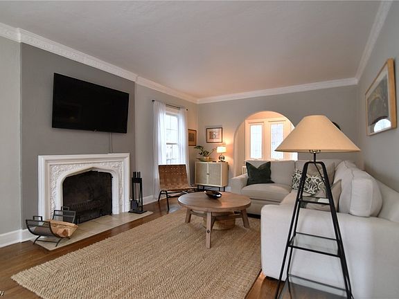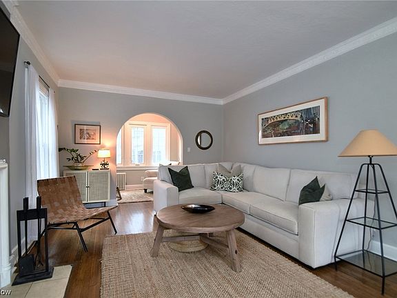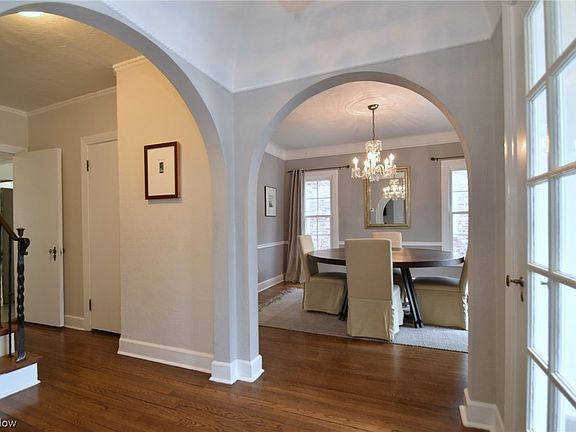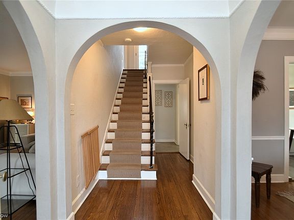 Absolutely charming 4 bedroom, 2.5 bath home in the desirable Sussex neighborhood of Shaker Heights. Short distance to the popular Van Aken District. Lovely home features light and bright living room with hardwood floors, wood burning fireplace and crown molding. Dining room with hardwood floors, chair rail and crown molding. Updated white kitchen (2020) with eat-in nook features stainless steel appliances, quartz counter tops, subway tile and Shaker cabinets. Office with built-ins, three season sun porch and half bath completes the 1st floor. Second floor has three bedrooms with hardwood floors and updated hall full bath. Primary bedroom with large walk-in closet (9x6). Third floor with additional bedroom, updated full bath with glass door shower and white subway tile and large walk-in closet. Updated lower level rec room offers work out area and family TV watching/entertainment area. Great home with pretty architectural details including arched entryways, carved plaster fireplace and crown moldings. Pretty rear yard with patio and is fully fenced. Many updates include: hot water tank (2021), boiler (2006), roof (2012-2013), many newer windows (2015 /2023), finished room in basement (2017), back patio (2017), 3rd floor full bathroom (2014), hardwood floors refinished on 1st floor (2017), chimney (driveway side - 2012/2013/2022), remodeled kitchen (2020), back porch - new flooring and painted (2020), replaced driveway (2017), washer (2023), dryer (2022). Great location, close to the VAD, schools, restaurants, shopping, RTA, Cleveland Clinic, University Hospital/Circle, Cleveland's cultural hub.
