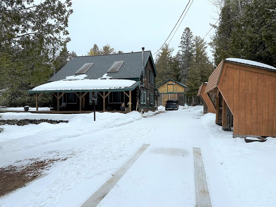 Weather you're looking for a summer getaway or year round home this custom built 1.5 story D Log Home has so much to offer. Well maintained three bedroom, one bath featuring 1740 SF, a vaulted celling over the dining and living area with upper floor skylights, stain glass windows and loft. Wraparound porch with open deck. A large spacious lot with garden area. 16x20 detached garage and several outbuildings. Seller will include an antique wood burning cook stove with sale. Located just a few minutes from the Les Cheneaux Islands and boating channel, 30+ miles from the Mackinac Bridge and St. Ignace.