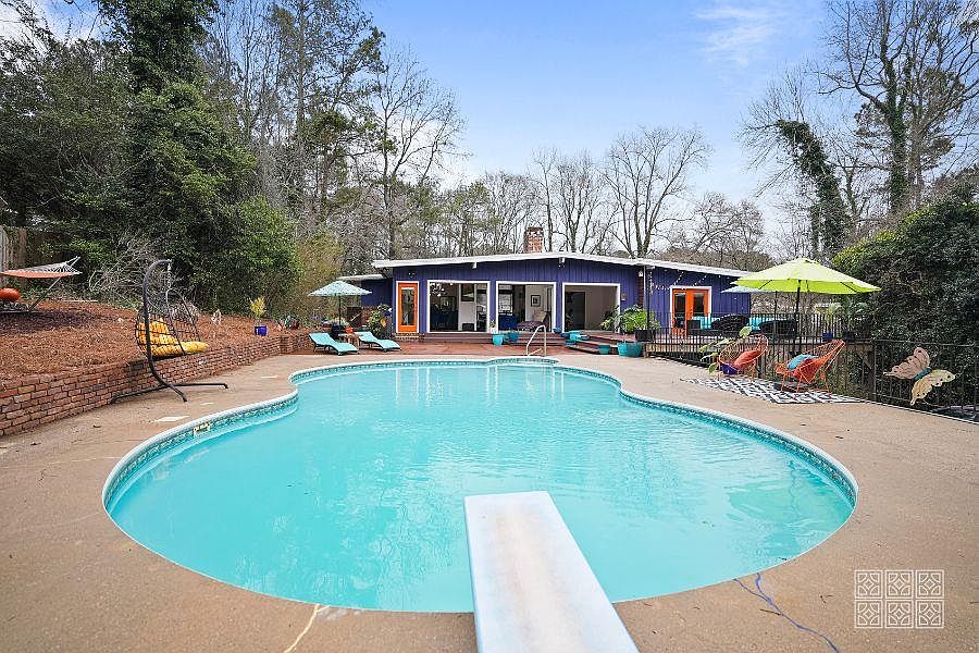 3679 Herschel Road is a magnificent Midcentury Modern home located in College Park, Georgia, offering a perfect blend of quality and comfort. The most quintessential & recognizable of MCM design can be found here: intersecting horizontal & vertical planes, post & beam construction, exposed wooden beams on the ceiling, massive brick hearth & fireplace, original vintage glass, wooden, & brass lighting fixtures, and walls & walls of glass which allow for the feeling of being in a secluded midcentury treehouse. This stunning property boasts a spacious floor plan with 3 bedrooms, 2 full bathrooms, a large & very private 2.3 acre lot, and a 2-car attached garage with additional outdoor parking for up to 18+ vehicles, providing ample space for families or individuals who desire a comfortable and spacious living experience. The garage is large enough to offer workshop space & has already been stubbed for a full bath. The interior of the home is designed with elegance and sophistication in mind, with vaulted ceilings, flexible open concept living, generous dining & kitchen area, and an abundance of natural light. The kitchen is equipped with top-of-the-line stainless steel appliances, stone countertops, midcentury-themed backsplash, electric stovetop, and abundant storage space. The bedrooms offer comfort and privacy, and bathrooms feature top-quality fixtures with sharp & minimalistic decor. The exterior of the home is equally impressive, featuring a private backyard with a sparkling saltwater pool & private lake access which is perfect for the outdoor enthusiast & outdoor entertainment and relaxation. With its convenient location to 75/85/285 & ATL Hartsfield Jackson International Airport, 3679 Herschel Road offers the perfect blend of luxury, comfort, and accessibility. The home went through a major renovation process on the main living area, which included new flooring, painting, brand new bathroom fixtures and installation of 3 garage doors to give an open and airy feeling. With all 3 garage doors open, having direct access to the wooden deck & pool, this home is an entertainer's dream. All pool systems were newly installed in 2019. The property has been designated as National Wildlife Federation Certified Wildlife Habitat & is adjacent to Camp Creek & Brandy Trail Nature Hiking & Walking Path. Don't miss this opportunity to own a piece of Atlanta's finest Midcentury real estate.