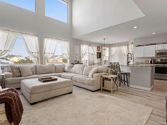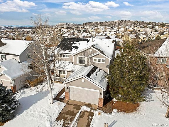 Welcome to this lovely home situated on a fully fenced lot that backs to open space with stunning mountain views. The property features a highly desirable open floor plan with two story Great Room, soaring ceilings and gorgeous picture windows which flood the home with natural light. Exceptional finish details include new luxury vinyl plank flooring, muted paint colors and upgraded lighting. A fresh white Kitchen boasts a large center island with stainless steel appliances, extensive slab granite countertops, large walk in pantry and a breakfast bar with seating for four. Stainless steel appliances include a dishwasher, refrigerator, microwave and five burner gas range. A rare main level guest suite with newly designed and updated 3/4 bath is perfect for those in search of first floor living. A lovely Dining Room and Living Room and large Laundry Room complete the first floor. The upper level Primary Bedroom is spacious with a spacious bathroom and walk-in closet. Three additional bedrooms with a hall bath overlook the main level. The finished walk out basement boasts a large recreation room, two more bedrooms which can also function as a fitness room and study and a newly updated 3/4 bath. The home features extensive storage and large mechanical room. The back yard showcases two decks with a hot tub and fire pit and gorgeous western sunsets overlooking community open space. Newly added features include a furnace and AC, solar panels, updated basement and main level bathrooms, crawl space vapor barrier, radon mitigation system, sump pump, garage door and opener and lighting, exterior lighting, some new interior light fixtures and ceiling fans, new vinyl plank flooring and kitchen faucet. The property is lovely and is turn key and ready to go. Located in Metzler Ranch, close to great shopping, restaurants and amenities all set in the beauty of Castle Rock.