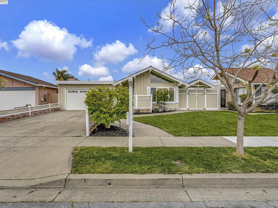 Charming single level Lake home offering 4 bedrooms and two full bathrooms with a front formal living room and a separate dining room with vaulted ceilings and custom wood wainscoting paneling. The spacious kitchen/family room combo features a fireplace with custom wood mantle, built-in shelving and a sliding glass door to the backyard patio. Custom designer kitchen with vaulted ceilings, white raised panel cabinetry & doors, custom solid slab countertop w/custom honed edging all around, fully tiled backsplash w/accents, breakfast bar & stainless-steel appliances. Custom master bathroom w/custom vanity, stainless-steel designer faucet, brushed nickel vanity light w/dimmer, large shower w/solid surface shower walls&shower pan flooring. Custom upgraded hall bath w/tiled half wall all around, large custom while tub&shower w/custom tile shower walls. Other fine features include beautiful laminate flooring, ceramic tile flooring in bathrooms, crown molding, skylights, master bedroom w/sliding glass door to the backyard, large 2-car garage with roll-up garage door, covered backyard patio w/overhead fan & more. Family-oriented neighborhood close to quality shopping&outdoor attractions. Great commute location - easy access to 880, 84 & BART, Silicon Valley&Peninsula. NO HOA