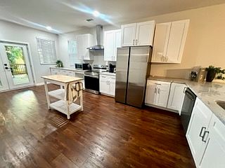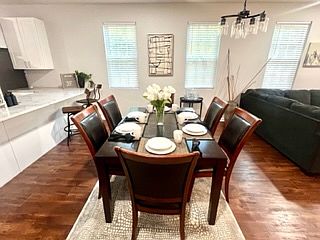 Accommodate up to 8 guests with this brand new Modern Farmhouse build!! You will find 4 luxurious bedrooms, all equipped with flat screen Smart TVs and ample storage. The separate, primary bedroom consists of a king bed, ensuite bathroom with garden tub, walk-in closet, dedicated office space and private back deck access. The other three bedrooms include two queen and two twin beds, each comfortably dressed to ensure a good night's sleep. Your stay includes an open concept home with a spacious, fully-equipped kitchen, high-end appliances, and designated dining and living room areas. Enjoy meals, cocktails & creating lasting memories with this retreat-like space. Additionally, you will enjoy the benefits of a dedicated work space, and both front porch and back deck outdoor living areas. We've got you covered with parking on both the side driveway (3 spots) and additional free spots in front of the house. Enjoy high-speed internet throughout the home and for a rainy day in, binge-watch your favorite programs through Xfinity, Netflix, Hulu, Prime, Disney, ESPN, HBO Max, Youtube, Peacock and more apps with the living room Smart Tv and comfy sofa. Beat the Atlanta heat and stay comfortable with ceiling fans in all bedrooms, providing a gentle breeze & a peaceful ambiance for a restful night's sleep. An in-unit washer and dryer will make it super easy for you to decide to stay a bit longer.