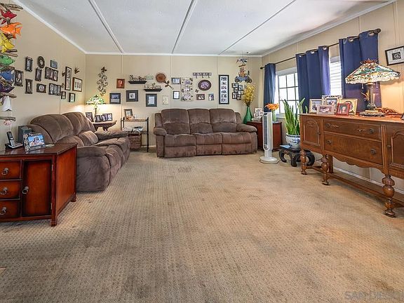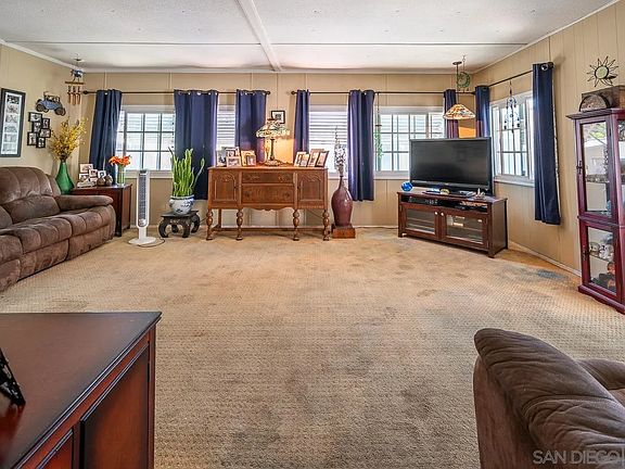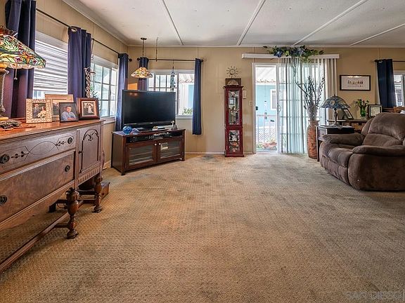 This charming 1967 mobile home, nestled in the highly sought-after Thunderbird Mobile Home Park in Chula Vista, offers a perfect blend of vintage character and modern comfort. With 2 spacious bedrooms and 2 full bathrooms, this home provides ample living space for relaxation and entertaining. The open-concept living and dining area is bathed in natural light, creating a warm and inviting atmosphere, while the functional kitchen features plenty of cabinet space and a cozy breakfast nook. The generously sized bedrooms provide comfortable retreats, with the primary bedroom boasting an en-suite bathroom for added convenience. While the home retains its classic appeal, it also offers potential for personalized updates to suit your style. Outside, enjoy peaceful moments on your private patio, perfect for morning coffee or evening relaxation. Located in a well-maintained and friendly community, Thunderbird Mobile Home Park offers amenities such as a clubhouse, swimming pool, and social activities. The prime location ensures you’re close to shopping, dining, and entertainment, with easy access to major freeways for commuting. Don’t miss this opportunity to own a piece of Chula Vista history in the welcoming Thunderbird Mobile Home Park. Schedule a showing today and discover the possibilities this 2 bed, 2 bath mobile home has to offer!
