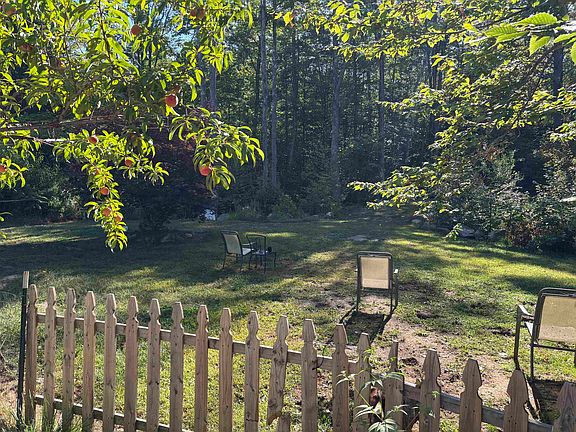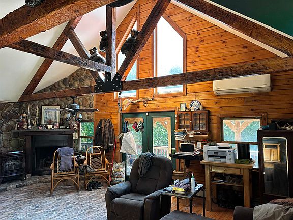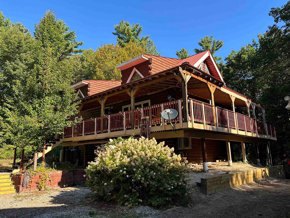Contemporary log home nicely set on 1+ acre. Home features an open living/dining/kitchen concept with vaulted ceiling showing exposed beams and fireplace. Primary bedroom and private bath occupies the entire second floor, with two additional bedrooms and a full bath on the main level. Large wrap around covered porch perfect for outdoor living. Lower level features an extended laundry room what could easily be used as an office or for additional sleeping space. 2 car finished garage under plus a detached 2 car garage large enough to support a car lift, boats and snowmobiles. Drilled well and state approved septic system. A large section of the lot is fenced and has been planted with fruit trees and grass perfect for your pets to run and play. Home is easy to get to on well-maintained town paved roads. Close to Rt. 16 and points south and north.