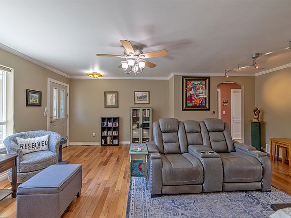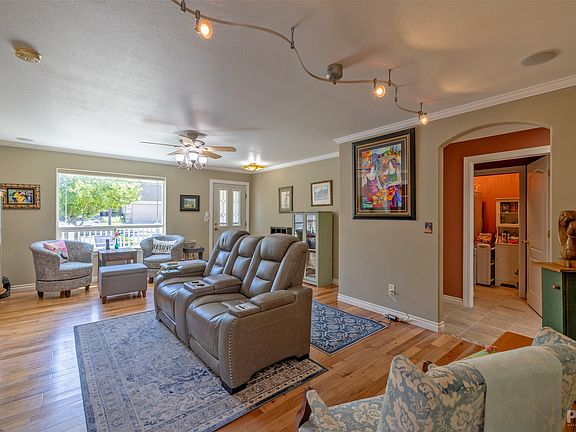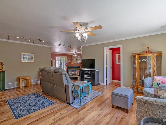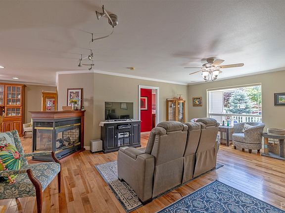 Easy to adore this single level rancher in the lovely Crystal Springs neighborhood. Built in 2004 for the current owner, it has more character than you'd expect for "newer" construction and unique custom upgrades including solid birch floors, crown moulding, double-sided fireplace, and two-tone painted kitchen cabinetry with solid surface countertops. The primary suite in a rich jewel-tone red enjoys a 5-piece bath and walk-in closet, while two guest bedrooms and full bath complete the split-bedroom floor plan. The attached double garage is insulated, finished, and has high ceilings and plenty of storage space. Exterior features steel siding, cultured stone accents and a welcoming front porch. Sliding glass doors off the dining room open to a zero maintenance deck with electric awning, a flagstone patio, mature trees, privacy fencing, a storage shed, and the most gorgeous English-style gardens brimming with vibrant perennials that will just take your breath away!