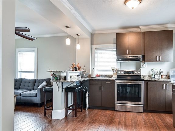 - Crown Molding, Upgraded Countertops, Bathroom with Shower Stall, Remodeled, Walk-Up Attic, Stone/Granite/Solid Counters, Bathroom With Tub & Shower, Living Room, Kitchen
