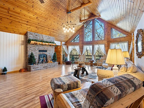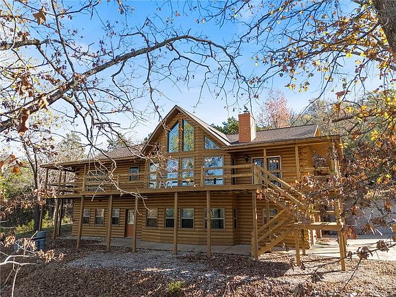 You have waited for that Log Home surrounded by trees on small acreage with a pond, not far from town and now here it is! High ceilings and window wall overlooking pond. Woodburning native stone fireplace in living room. Granite countertop of breakfast island. Small breakfast room off kitchen. Large main bedroom suite with large closet. Lower level has woodstove supplement heat and lots of room for house guest. Oversized 2 car garage in lower level with concrete entry. Wrap around front porch and large deck on back. New roof w 30 yr warranty installed in September 2024. New detached 10 x 20 storage building with loft. This 13 plus acres surrounds this home making a very private setting. 3 Bedrooms and two baths on main level Just a few minute drive to downtown historical Eureka Springs. This is a nice home.
