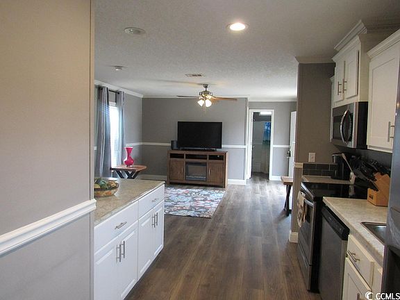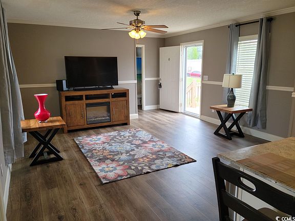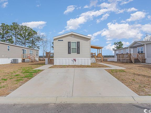 Welcome home! This charming 2 bedroom, 2 full bath home is perfectly situated just 5 minutes away from the vibrant Market Common area. With custom features galore, this home is sure to impress! Step inside and be greeted by 8 foot ceilings, drywall and chair railing throughout. The open floor plan is spacious and airy - perfect for entertaining guests or simply relaxing with loved ones. The vinyl flooring is not only aesthetically pleasing but also easy to maintain and durable. The kitchen boasts stainless steel appliances, a stylish back splash and ample counter space - perfect for whipping up a gourmet meal. The modern design features an island that doubles as a breakfast bar - or step through the sliding glass doors and eat al fresco!  The master bedroom is a true sanctuary, featuring an en suite bath with double vanity, walk in shower and ample storage space. With the split bedroom layout, privacy is a priority with the 2nd bedroom on the other side of the home.  Outside you will find the large covered porch where you can take in the serene surroundings as you enjoy your morning coffee or an evening cocktail. This is the perfect spot to relax and unwind after a long day. With its custom features and prime location, this charming home is truly a must-see. Don't miss out on the opportunity to make it yours! (Home is on leased land - land lease includes trash pickup and lawn care.)
