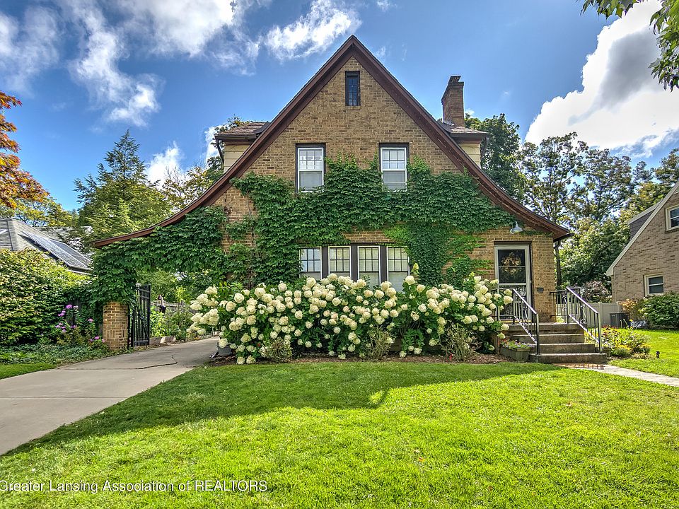 Storybook brick Tudor style 3 bed home located in the desirable East Lansing Chesterfield neighborhood. From the quaint entry with built in bench to the light filled living room - you'll fall in love. Charming dining room features large bay window and opens to stylish modern kitchen with crisp white cabinets and stainless-steel appliances. Amazing adjacent butler's pantry allows for plenty of storage plus coffee corner and built in spice rack! Cozy four seasons addition allows for additional living space with glorious views of wooded tree lined yard. Classic full bath upstairs has original black and white tile and built in linen tower. Cherry primary bedroom is roomy with panoramic views of nature! But wait... there's a surprising 3rd story with shiplap ceiling and cozy carpet - perfect for playroom or game room! Exterior is equally as charming with fully fenced back yard, one car garage, expansive garden alongside drive, stately iron gate and a lovely front border of annabelle hydrangeas frames the home.