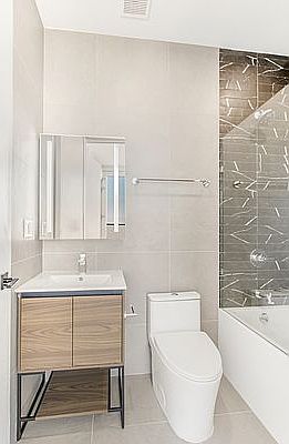 A brand-new building nestled on a quiet tree-lined street at the convergence of Williamsburg and Greenpoint, this modern 1-bedroom, 1-bathroom home blends sleek fixtures with organic textures while maximizing space and natural light. The apartment begins with a welcoming foyer with a coat closet. The open-concept living, dining and kitchen space has beautiful hardwood floors, gallery-style walls, and floor-to-ceiling windows. The kitchen is equipped with ample storage space, alluring white quartz countertops, sleek black marble texture cabinetry and high-end stainless-steel appliances. The bedroom has a built-in reach-in closet and easy access to a pristine full bathroom with a custom floating vanity, stone slab walls, and chic matte black fixtures including a rain showerhead. A private balcony off the bedroom is perfect for entertaining, sun lounging, urban gardening, and more. An oversized terrace perfecting for hosting and entertaining along with a washer/dryer completes the home. Residents of 368 Leonard enjoy an array of thoughtful amenities meant to complement and facilitate the needs of daily life. Included are a landscaped dog run, a welcoming lobby with a virtual doorman system, a package room, bicycle storage and a vibrant rooftop deck with grilling stations, an outdoor kitchen, dining and lounge furniture, and panoramic views that encapsulate the Manhattan, Queens and Brooklyn skylines. Nestled between Williamsburg and Greenpoint, 368 Leonard is moments from dozens of charming restaurants, boutiques, cafes, and bars. It is a step away from McCarren Park. The L and G subway lines are right around the corner, and the North Williamsburg NYC Ferry stop is less than ten minutes away.