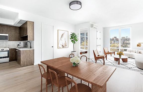 368 Leonard captivates the eye and soothes the mind with chic interiors and a robust amenity package. Situated on a beautiful tree-lined street at the convergence of Williamsburg and Greenpoint, this brand new building has 10-curated residences offered in spacious 1- to-2-bedroom layouts. Each apartment at 368 Leonard is an expression of contemporary elegance and refinement, incorporating classic design elements with the openness and tranquility of living in close proximity to McCarren Park. Natural light pours in through floor-to-ceiling windows, spilling over beautiful hardwood floors and accentuating warm tones and subtle details. Kitchens are attractive and functional, equipped with custom cabinets, cove lighting, stainless steel sinks, bold quartzite countertops and backsplashes, and high-end integrated appliances. Custom vanities, backlit oversized mirrors, and deep soaking tubs punctuate marble-clad bathrooms. All apartments enjoy floor to ceiling windows, and are completed with a convenient in-unit washer/dryer. Residents of 368 Leonard enjoy an array of thoughtful amenities meant to complement and facilitate the needs of daily life. Included are a landscaped dog run, a welcoming lobby with a virtual doorman system, a package room, bicycle storage and a vibrant rooftop deck with grilling stations, an outdoor kitchen, dining and lounge furniture, and panoramic views that encapsulate the Manhattan, Queens and Brooklyn skylines. Nestled between Williamsburg and Greenpoint, 368 Leonard is moments from dozens of charming restaurants, boutiques, cafes, and bars. It is a step away from McCarren Park. The L and G subway lines are right around the corner, and the North Williamsburg NYC Ferry stop is less than ten minutes away. Smoking allowed:No