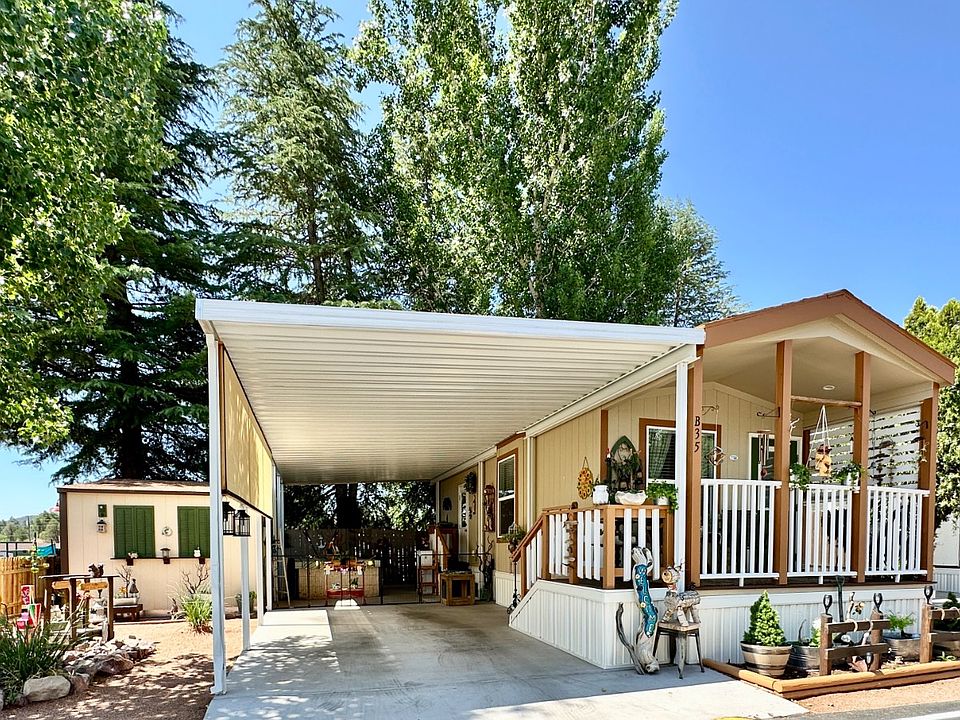 Tucked into the cool pines of Star Valley, this 2023 Champion Athens Park Model offers a beautifully maintained retreat in the highly desirable Pineview 55+ Resort. Set on a corner lot with panoramic mountain, wooded, and scenic views, this 1-bedroom, 1-bath home boasts a spacious 396 SF layout with tasteful upgrades and outdoor features perfect for relaxing or entertaining. Inside, you'll find laminate flooring throughout, an open-concept kitchen with a gas range, microwave, and stacked washer/dryer, along with a cozy living space filled with natural light. Enjoy the convenience of in-unit laundry, heat pump HVAC, and ample cabinetry. The home includes handicap-friendly features for enhanced accessibility. Step outside to enjoy the covered deck, privacy fencing, trees, and tidy landscaping, plus a large Tuff Shed for storage or hobbies. The extended carport and patio provide shade and space for entertaining or unwinding with nature. Lot rent is just $485/month plus metered electric and includes water, sewer, trash, and basic cable. The UTV-friendly, pet-friendly Pineview community features a clubhouse, laundry, new pet park, and storage. Located near Tonto National Forest, lakes, trails, and more-you'll love the easy access to outdoor recreation while escaping the heat of the Valley. #StarValleyAZ #PineviewResort #55PlusCommunity #ChampionHomes #ParkModelLiving #AZRetreat #MountainViews #ScenicEscape #UTVFriendly #PetFriendlyLiving #AZSnowbirds #RetireInArizona #ActiveAdultLifestyle