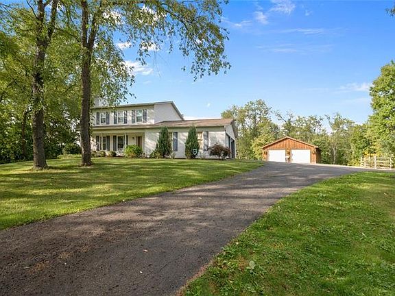 Its ideal setting brings 8 acres of tree spotted privacy to this modern 3 BR 1.5 BA farmhouse style. Positioned at the end of a long driveway means less road noise, yet within an easy commute of Pittsburgh with access to 422 and 79 within minutes. If you love the outdoors and have a lot of hobbies, you will be smitten by the covered rear patio and oversized detached 2-car garage that reside in the backyard with plenty of open yard space left to spare for your favorite activities. A brick log burning fireplace chases the chill and beckons you to spend quality time in the living room. This space connects to the formal dining room with entry onto the spacious yet intimate covered patio, giving you multiple options for gathering space. The owner bedroom has the walk-in closet space you have been longing for and a roomy space to lay your head. A full bath displays attractive recent updates. Lower level family room. Attached 2-car garage.