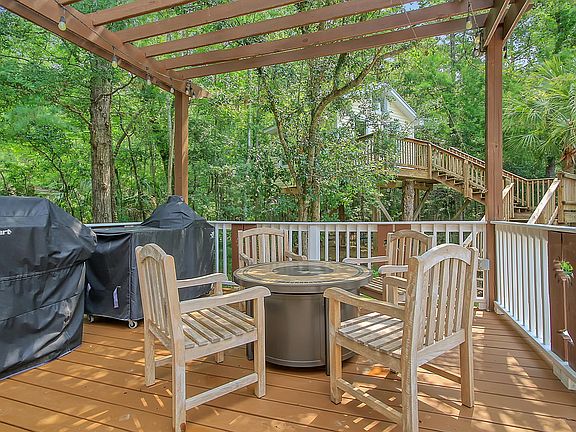 Welcome to this exceptional 5 bedroom, 3.5 bathroom custom built home located in the much sought-after Darrell Creek subdivision. With its spacious layout, pristine landscaping, and fantastic outdoor features, this unique property has something for everyone. The hardwood floored main level boasts a 2800 sft open floor plan, complete with a magnificent owner's suite, allowing for seamless flow between the living spaces. The luxurious owner's suite is a true sanctuary, featuring a spa-like bathroom complete with a soaking tub, separate shower, and double sinks vanity. The designer kitchen features newer stainless-steel appliances, including electric stove, ample storage, and a center island, making it a dream for any aspiring chef. The kitchen flows into a stately dining room, perfect forhosting dinner parties and special occasions. The great room is adorned with a cozy fireplace and custom shelving, creating a warm and inviting atmosphere for relaxation and entertainment. Three guest bedrooms, a full bath, half bath and a versatile study/home office space complete the main floor. Upstairs you will find a second owner's suite with its own private bath. One of the highlights of this incredible property is the completely private, oasis-like backyard that backs to wooded wetlands. The 10,000 gallon heated/chilled inground pool with electric cover are the perfect setting for relaxing and entertaining under the sun, or the stars! The spacious screened porch opens to an open 16 x 16 deck and pergola that is ideal for hosting gatherings and creating lasting memories with family and friends. Adults, young and old, LOVE the custom built, fully furnished 200 sf tree house overlooking the pool! (And, yes, it's truly a tree house!). This home is truly a rare find, with access to amazing schools and convenient to amenities like shopping and dining, Roper Hospital, Costco, and beaches, providing the total package of a vibrant lifestyle for you and your family.