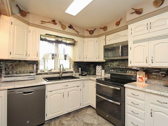 If you have a love for the outdoors, this is your home! This 3 bedroom, 3 full bath home has been well maintained and is very economical with geothermal heating. The family room offers a great view, and a fireplace with built-ins for your favorite books & treasures. The kitchen has great cabinet and counter space and comes equipped with new slate appliances. The sunroom offers large windows with framing views of the backyard oasis that includes a dock for fishing, and a private beach area for swimming! Relax in the master bedroom with en-suite, walk-in closet, and patio doors leading to a deck overlooking the water. The two car garage also has a 10x18 work shop with attic storage space. Store the lawn & garden tools and fishing poles in the extra storage shed. This is a house that you can't wait to come home to!