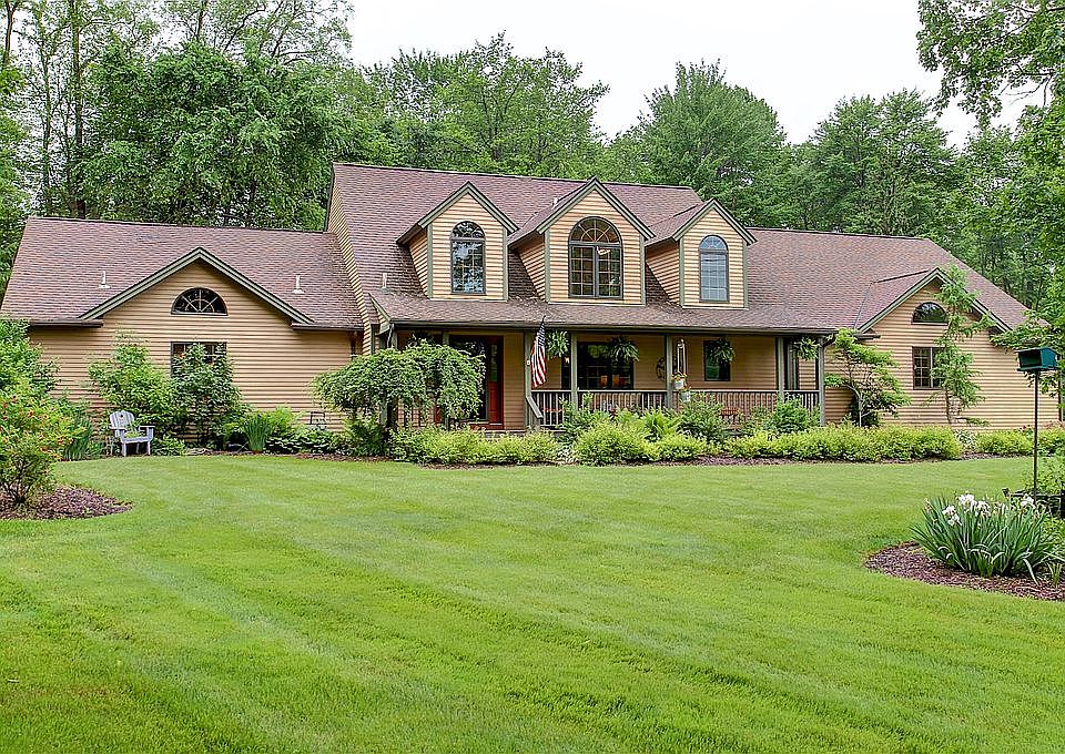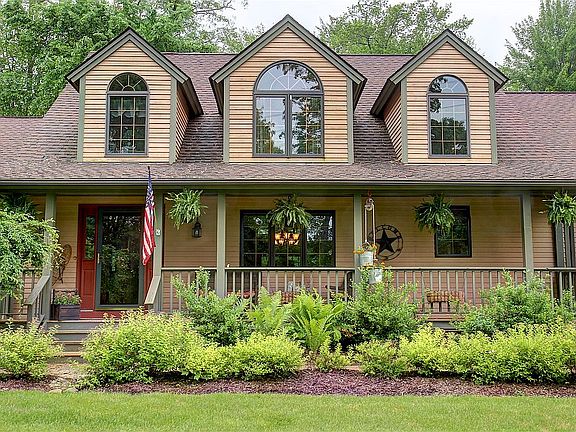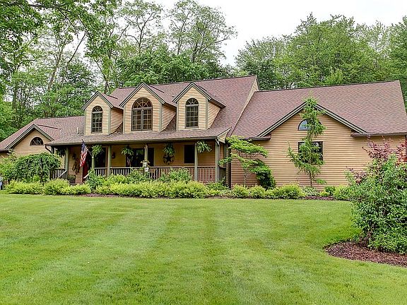 This beautifully unique home sits on 4 acres with total privacy on a wooded setting. Cedar plank siding with each board individually stained and treated during installation. New TREX deck extends across the back of the home with access to master bedroom and great room. Enter the front of home through spacious front porch to a wide tiled foyer and large closet space. The great room opens up to high post and beam ceilings and river stone wood burning fireplace & hand carved mantle with floor level windows across the back of home. Wood floor dining room leads to kitchen with granite tops, double oven, large island with gas counter top range. First floor master bedroom with large master bath and two walk in closets. Office is off of master with open ceilings. First floor laundry room. Plenty of space from garage entry for shoes, coats, book bags, as you enter the home. roomy 3+ car garage. Second floor has full bath and two spacious post & beam bedrooms. Additional space above garage can be converted to living space, access from bedroom walk in closet. All mechanicals have been regularly maintained. New carpet on first and second floor. Unfinished basement offers a great work or play area and ready for buyer personal touch to finish. Please call for your private showing!