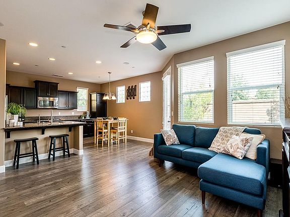 This Immaculate, Move-in-Ready Wilson Elev8ions 3 Bed 2.5 Bath home has gorgeous wood laminate flooring throughout. Enjoy the open floor plan and the light and airy ambiance. The kitchen features gorgeous granite counters, stainless steel appliances, a breakfast nook and breakfast bar. All bedrooms and the laundry room are upstairs, giving you privacy and separation. There are ceiling fans in all rooms with remotes and energy-saving lights in the bathrooms. The low-maintenance backyard has space to chill or enjoy a BBQ with friends. This is a perfect home for a first-time home buyer and investor alike. Harlan Ranch has something for everyone. This beautiful community was is designed to encourage residents to embrace the outdoors with tree-lined paths, picnic areas and playgrounds at the several parks throughout, or cool off on a hot summer day at the pool.