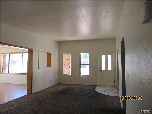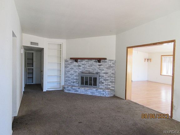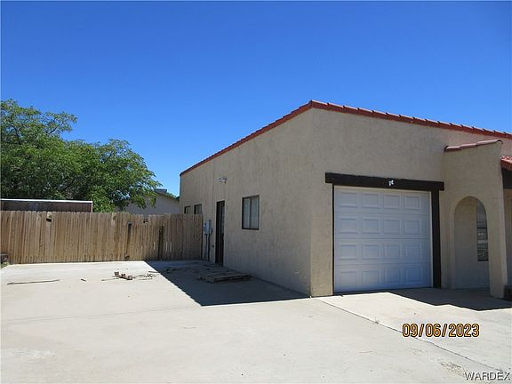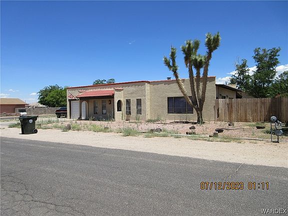 Large 1820 sq ft 3 bedroom/2 bathroom home with attached garage on 100X100 corner lot* You will appreciate this properties close proximately to shopping, dining and medical**The flat adobe style roof was just recoated with a licensed contractor* Brand new garbage disposal installed** The home sits back giving plenty of room for parking* Enter in to the spacious living room with wood cozy burning fireplace* to the right you have a large family room with wood laminate flooring, fun bar for entertaining, 2 ceiling fans, large view windows for natural lighting & sliding glass door to covered patio** Dining area off the kitchen* Kitchen has a breakfast bar, electric range over, dishwasher, refrigerator, plenty of cabinets and garbage disposal** King-size owners suite with privacy bathroom, walk-in shower** 2 spacious guest bedrooms and full size guest bathroom with tub/shower combo** One car attached garage* rear yard has a covered patio, privacy wood fencing, mature tree and shrubs, storage shed & extra power outlets for lighting etc*This Large yard will be great for entertaining **You'll appreciate the amazing Arizona sunsets** 45 minutes to Laughlin Nevada Casinos, Lake Mohave & Colorado River