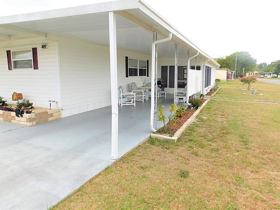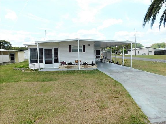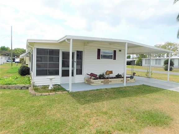 Need some Florida sunshine...Your beautiful dream home awaits in an active 55+ community where you own your own land with a low HOA fee of $299.59/year. This spacious immaculately maintained home offers 2 BR 1-1/2 bath with open floor plan between family room, dining room, and kitchen. This home is in top condition with metal roof over, central AC/heating 2019, double pane windows, laminate flooring, and showcases many beautiful updates in all rooms of the home. The open floor plan is great for entertaining and crafting. The beautiful eat-in kitchen has updated fixtures, large sink, electric range, refrigerator with ice maker, and laminate flooring.. The home also offers a large Florida room (10'17'), Sun porch (10'x12'), Second sun porch (16'x10), Storage room (10'x7'), workshop (7'x7'), inside washer, nicely painted driveway, and great corner lot location. Full bathroom offers tub/shower combo, laminate flooring, and high toilet. This beautifully furnished home has curb appeal that starts outside and does not stop throughout! Don't miss this opportunity to own your vacation get away. Don't forget its near the 27 holes of golf, 2 swimming pools and 2 hot tubs along with 3 clubhouses, a library, walking paths, game rooms (Billiards, Table Tennis, Board Games) miniature golf, enclosed shuffleboard courts, tennis courts, pickle-ball courts, basketball court, Boccie courts, and Bingo. * Additional fees may apply* Call for an appointment today.
