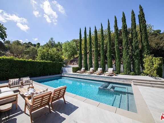 Furnished & Turn-Key, this exquisite residence is set within the exclusive enclave of The Benedict Collection at the southern edge of Sherman Oaks. One of only seven homes tucked at the end of a peaceful cul-de-sac, the property captures sweeping views of the San Fernando Valley and the San Gabriel Mountains. Completely reimagined with meticulous attention to detail, it blends timeless elegance with the ease of modern indoor-outdoor living. The formal living room opens to a manicured backyard featuring a large pool and spa, lush lawn, and expansive lounge deck perfect for both refined entertaining and casual relaxation. The chef's kitchen is a true showpiece with custom cabinetry, premium appliances, a large center island, and a bright breakfast nook overlooking the valley. A poolside dining pergola with a full outdoor kitchen completes the entertainer's dream setting. The primary suite offers a serene retreat with a fireplace, private office or sitting room, and a spa-inspired marble bath. Additional highlights include a family/media room, and guest suite on the main level, and a lower level with a mirrored gym, private theater, playroom or den, laundry, and three en-suite bedrooms. Elegant, private, and effortlessly livable this turn-key estate embodies elevated California living at its finest.