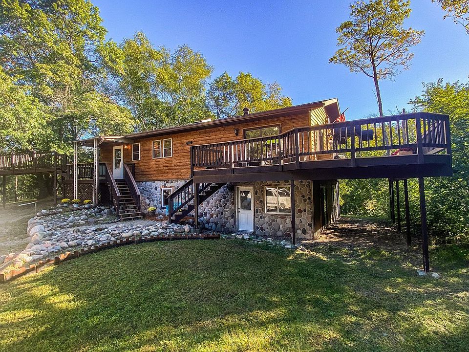 This beautiful 3 bedroom 2 bathroom home is nestled on 2.3 acres of mature trees and private setting. New large deck surrounds this open floor plan home for all your outside or inside entertaining! Main floor laundry and master suite are a bonus! Stunning stone fireplace welcomes you in with double sliding doors on both sides to walk out onto the large deck! The potential is endless! Close to downtown Pequot Lakes, Sibley Lake, and Highway 371!