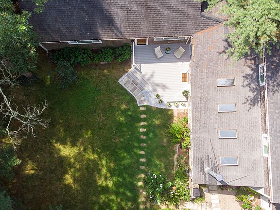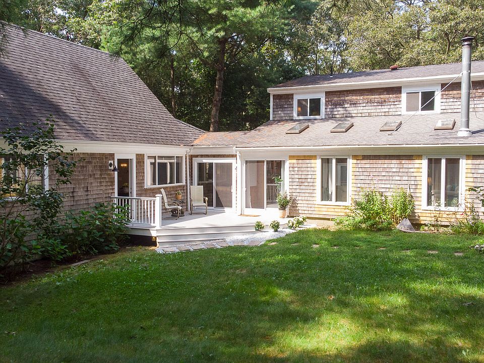 Two beautiful dwellings on one property--how will you use them? As a family apartment or rentable accessory dwelling unit (both applications are available at the Barnstable town website)... The main house has one of its bedrooms, an extra room, full kitchen, bath, and laundry all on the first floor, with a huge primary suite upstairs plus a sunny private patio garden. Overlooking the big back yard is the apartment, with a big beautiful bedroom, an office/den and one bathroom, all on the same floor..Plus a full gorgeous kitchen, full basement, and an additional, private 'tree house' deck. The long driveway takes you far off the road into a totally wooded yard but for the cleared, grassy back lawn. A shared porch connects the two living areas for a cohesive but separate living arrangement.